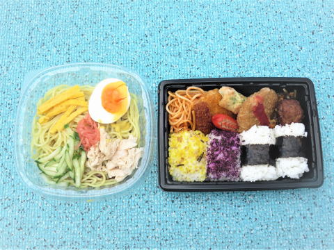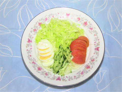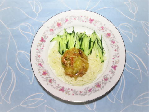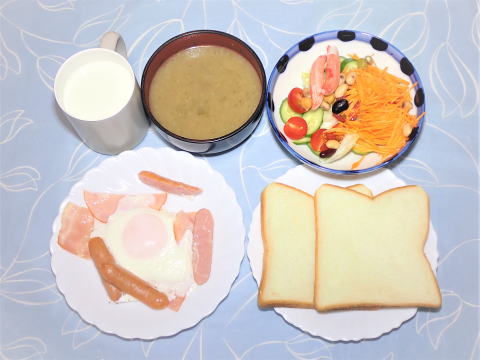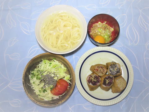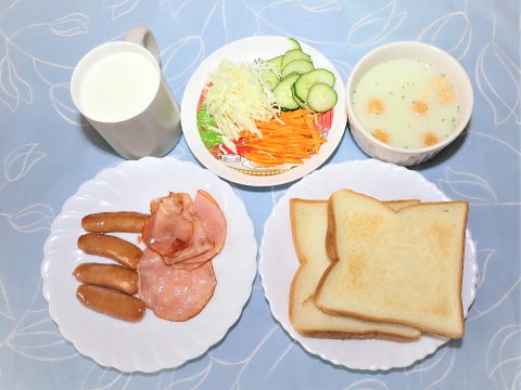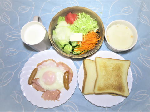 | 11日(木) 目玉焼き(卵・ハム・ウインナー)+野菜サラダ +カマンベールチーズ+ポタージュ(インスタント)+トースト+牛乳♪ ![]() 冷やしそう麺(揖保乃糸・野菜かき揚げ ・キュウリ・冷やしそうめん汁)♪ ![]() |