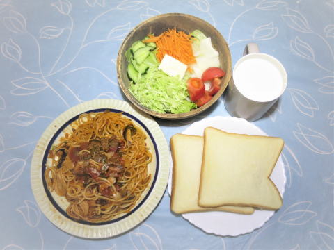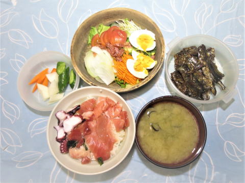 | 9日(火) 海鮮丼(マグロ中トロ・切り落とし・タコ・白飯)+具だくさんサラダ +シジミの味噌汁+サンマの甘露煮+三種のぬか漬け♪ ![]() スパゲッティーナポリタン(レトルトソース・挽き肉 ・玉ねぎ・ピーマン・椎茸)+野菜サラダ+トースト +オニオンスープ(インスタント)♪ ![]() |