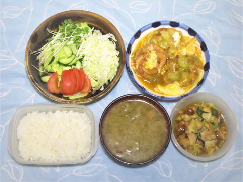 | 6日(土) アナゴと大きな海老の天ぷら重と冷たいそばのセット♪ ![]() 豚肉とキムチ炒め(豚肉・キムチ・玉ねぎ・ニラ)+野菜サラダ +豚汁(豚肉・玉ねぎ・ニンジン・椎茸・ゴボウ)+炊きたてご飯 +三種のぬか漬け(惣菜:大根・キュウリ・ニンジン)♪ ![]() |