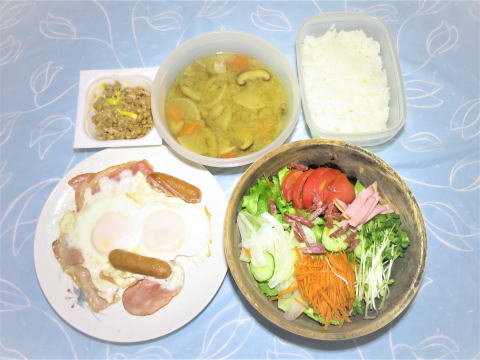 | 7日(日) 目玉焼き(卵・ハム・ベーコン・ウインナー)+具だくさんサラダ +豚肉とキムチ炒(残り)+具だくさんサラダ+豚汁(残り) +納豆+ご飯+三種のぬか漬け♪ ![]() |