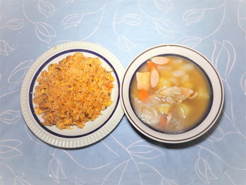 | 10日(水) 鍋の残り丼(鍋の残り・豚肉・白菜・生卵・ご飯) +自家製カブの塩漬け+あさりの佃煮♪ ![]() キムチチャーハン(キムチチャーハンの素・キムチ・ご飯) +特製ポトフ(厚切りベーコン・ウインナー・カブ・大根・人参 ・コンソメ・白湯スープの素)+あさりの佃煮+自家製カブの塩漬け♪ ![]() |