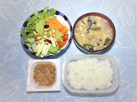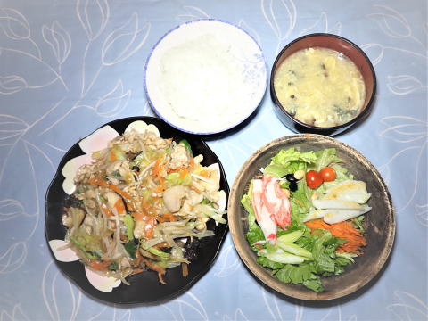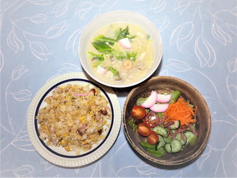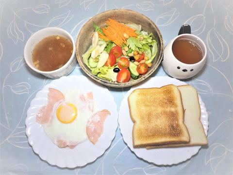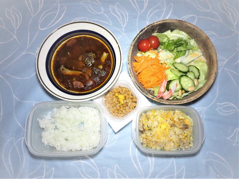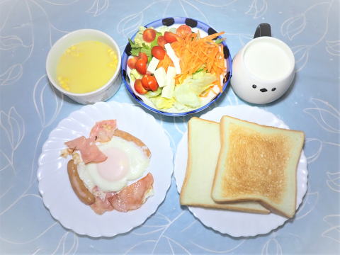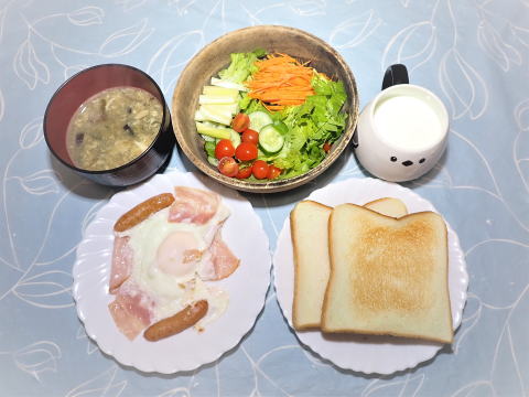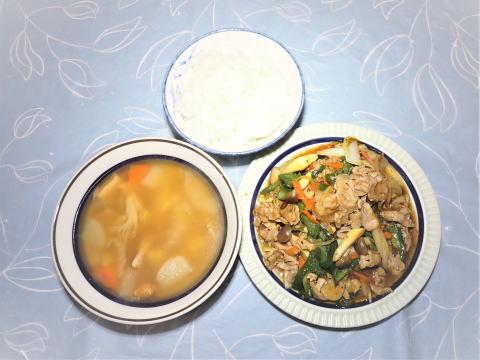 | 20日(土) 目玉焼き(卵・ハム・ベーコン・ウインナー) +牛肉ハンバーグのビーフシチュー煮(残り) +野菜サラダ+トースト+牛乳♪ ![]() 肉野菜炒め(もやし炒めの素・豚肉・キャベツ・ニンジン・ピーマン ・もやし・椎茸・キクラゲ)+鶏肉とコーンの中華風スープ(スープの素 ・手羽先・卵・ぶなしめじ・キクラゲ)+具だくさんサラダ +炊きたてご飯+野沢菜漬け+カツオたくあん♪ ![]() |