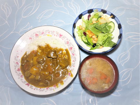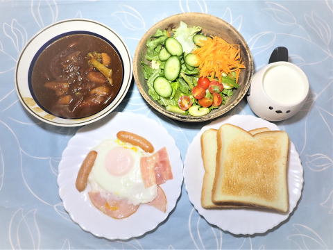 | 28日(日) 目玉焼き(卵・ハム・ベーコン・ウインナー)+野菜サラダ +カマンベールチーズ+トースト+オニオンスープ+牛乳♪ ![]() ベーコンとほうれん草のグラタンチーズ焼き +合鴨パストラミ+カマンベールチーズ♪ ![]() ビーフカツカレー(カレールー・惣菜三元豚のカツ・和牛もも肉 ・タマネギ・ニンジン・ジャガイモ・カレーパウダー・牛乳・バター) +豚汁(豚肉・タマネギ・ニンジン・ジャガイモ・ゴボウ) +具だくさんサラダ+炊きたてご飯+野沢菜漬け+カツオたくあん♪ ![]() |