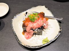 | 三角揚げすき焼き風丼(残り・生玉子)+3種のぬか漬け(大根・キュウリ・カブ)♪ |