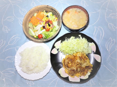 | 7日(日) ソース焼きうどん(玉うどん・豚肉・キャベツ・もやし ・人参・ピーマン・舞茸・ソース焼きそばのタレ)♪ ![]() チキンピカタ(鶏もも肉・キャ+ベツの千切り・卵)+豚汁 (豚肉・玉ねぎ・人参・ゴボウ・大根)+具だくさんサラダ +炊きたてご飯+ちょい辛胡瓜と茄子の漬物♪ ![]() |