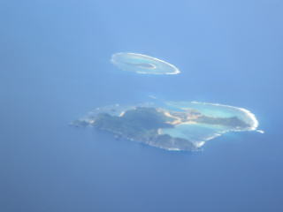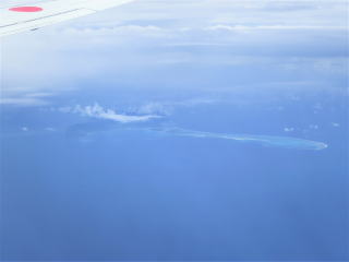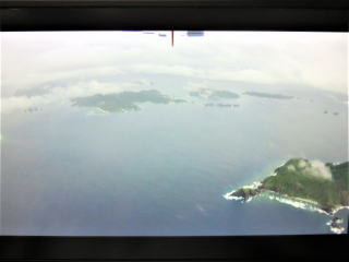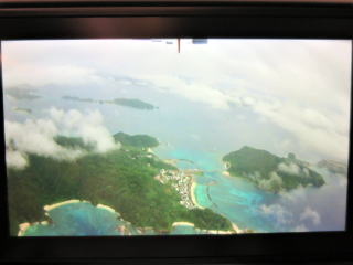 12時24分ドア閉まる→27分安全についての説明→29分動く→32分移動→12時40分離陸→雲の下高度300m位を飛行した。大きく旋回しないで慶良間諸島の西側を通って、粟国島・渡名喜島の東を飛行した。すぐに久米島のハテの浜が見えた。12時49分頃慶良間諸島の北・久米島の南側を大きく回り込んで飛んでいた。ネットで雲の様子を見たら、雨雲を避けて飛んでいるんだろうと思った。