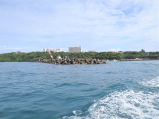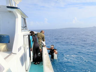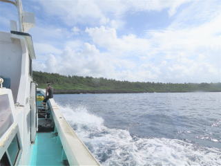 船長から船の説明があって、8時50分頃出航した。海はちょっと波がある程度で、遠くの浅瀬は白波がバンバン立っていた。1本目は水納島付近に行った。ポイントに着いて綾人くんが海の様子を見に行ったら、かなり透視度が悪いようで、流れもある?ようなので、別の所に移動した。
