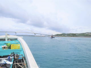 楽しんで4時15分過ぎに船に戻った。器材を片付けて4時20分頃港に向けて出航した。瀬底大橋をくぐって4時40分前に港に戻った。