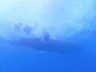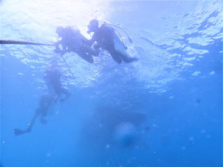 9時半頃ジャイアントでエントリーした。エントリーの時フィンがラダーに挟まって抜けなくて苦労した。ブリーフィングで、海面近くの透視度はかなり悪いようなので、エントリーしたら海面を移動して、船の後ろのロープにつかまって海底まで潜るように言われた。