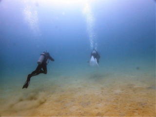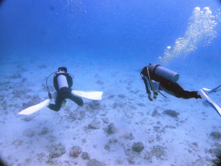 水深3m〜5m位は久しぶりに透明度が最悪だった。7m〜8mまで潜ると視界が開けてきた。マスクのベルトがちょっと緩くて、海水がだいぶ入ってきた。砂地にある根を見ながら移動した。根にはスカシテンジクダイとかがたくさんいた。なかなか楽しめた。女性が浮き気味だったので、インフレーターの排気ボタンを教えたが、エアーは出てこなかった。ウエイトが軽いようだった。浮いて行きそうになったので手を引いて海底まで誘導した。石を持たせようと思ったが、余計なお節介かと思って渡せなかった。安全停止に入った時、目まいがして気持ち悪くなってしまった。