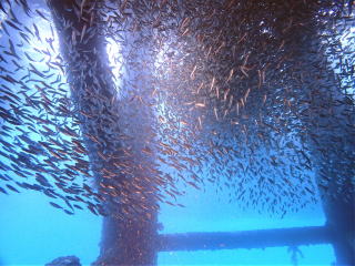 透視度は今日1番で良かった。砂地に大きな根が一個あった。他に根のような物はなく、砂地でいろいろ探しながら桟橋の方に泳いでいった。桟橋と言っても船が出入りするわけではなく、何かの運搬船?がいつも停泊していた。桟橋の近くに来ると、たぶんガジュン?の群れが広がっていた。なかなかの数でちょっと驚いた。あまり近づけなかったので、銀色の魚の色とちょっと濁った海水とで、姿が少しぼやけていたのが残念だった。橋脚の下にグルクマの群れがいた。あんなに近くで、グルクマが口を開けている姿を見たのは初めてだった。たくさん写真を撮った。初めて桟橋の下に入った。中は薄暗かったが、本当に無数のミジュンが塊の群れを作っていて、光を当てると「パッ」と散らばって、また塊になるのが面白かった。数は数万匹はいると思った。見ていて飽きなかった。ミジュンが一匹息絶え絶えで海底に横になっていたので、写真を撮って全体の姿を確認した。後で調べたら…ミジュン:ニシン目、ママカリ、シンコ…の事だった。以前バラス南で見たミジュンは、もっと小さかった気がした。アッという間の45分だった。