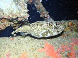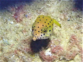 気分も良くなったので、だいぶ余裕が出ていた。おば様は浮き気味にならずに泳げていた。ただ 1本目からフィンキックの数が多いのが気になっていた。岩場のポイントなので、透視度は少しは良くなっていた。岩のエッジ伝いに泳いで、谷間や広場を泳いで、トンネルをくぐって外に出た。トンネルをくぐる時に、以前タンクがつっかえてしまった出口だと思い出した。谷間では岩穴にハタンポやコブシメやテングガワハギが普通に泳いでいた。ライトを照らして魚がいることを見せてあげた。無事にダイビングができて11時40分頃船に戻った。