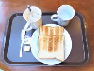 7時に目覚ましで起きました。シャワーを浴びて体を温めて、7時15分頃朝食を食べに降りました。トーストとカフェラテを飲んで、7時半過ぎに戻りました。