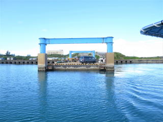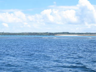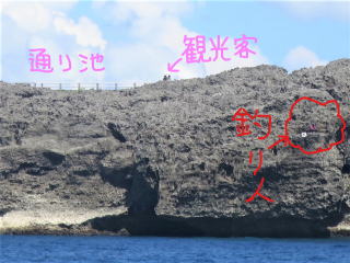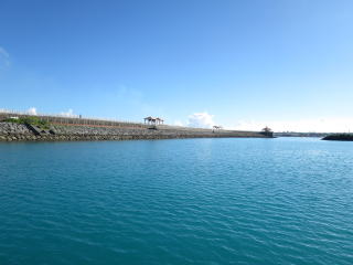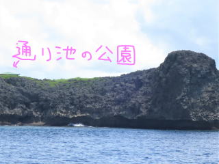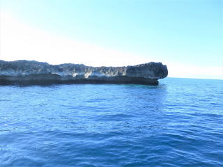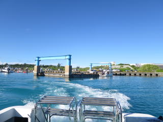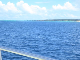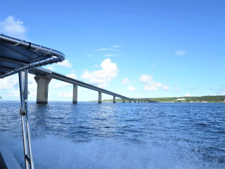メッシュバッグに器材をしまって、帰り支度をして1時50分頃出航しました。船の船首に座って風を受けながら船旅を楽しみました。途中通り池の所に人がいるのが見えました。柵の手すりも見えました。宮古ブルーを満喫して、伊良部大橋をくぐって、2時半前に港に戻りました。