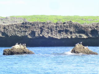 少し移動して2本目のポイントで休みました。離島で良く見る白い鳥…アジサシ?が小さな狭い岩に群れていました。沖縄にはカモメがほとんどいないらしいです。2本目は10時40分頃「一の瀬ドロップ」に入りました。