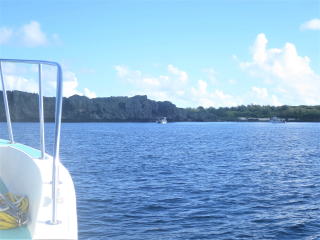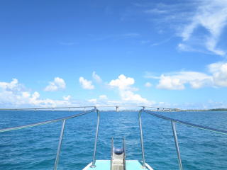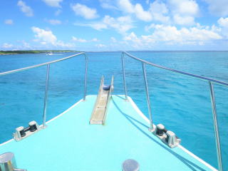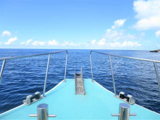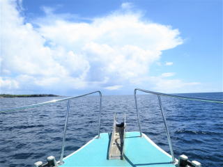 11時40分前に船に戻りました。3本目のポイントに移動してから、昼食を食べることになりました。3本目は下地島空港の誘導灯の近くまで移動しました。船の船首で陽に当たりながら、しばし船旅を楽しみました(*^_^*)♪