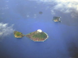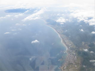 2時25分シートベルト着用のサインが出ました。荒天のためだと思ったら、すぐに30分利島が見えました。もう伊豆諸島の上空まで来ていました。大島はほぼ雲に隠れていました。もしかしたら九州の南にあった台風の上を飛び越えてきたかもしれないと思いました。
