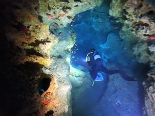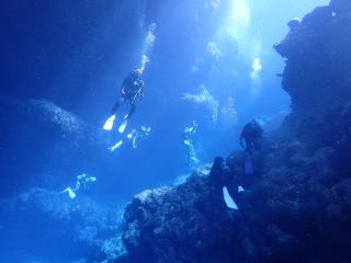 9時頃1本目のポイントの「ミニ 通り池」に着いて、9時15分頃エントリーしました。今回は船の後ろでたくさんの人が準備していたので、前からバックロールでエントリーしました。綾人くんのところで慣れていて良かったと思いました。