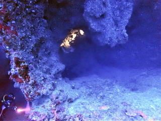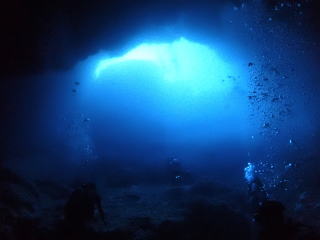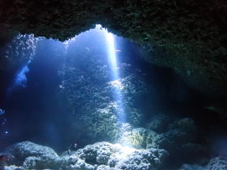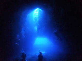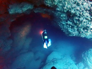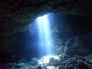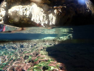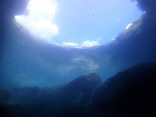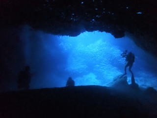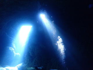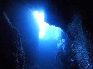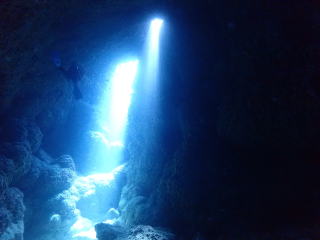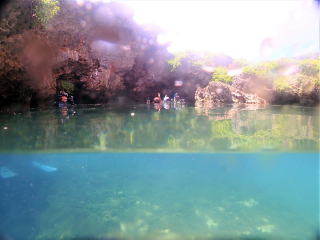 今回潜りたかったポイントの1つでした。光の加減と大きな洞窟の様子は、なかなか迫力があって好きなポイントです。池に浮上しました。池の底には「藻」がたくさん付いていました。川本さんが「藻から泡が出ていますが、光合成をして吐き出した酸素ですかね?」と言っていました。良く見たら確かに泡を出していて、光合成をして作った酸素だろうと思いました。ミニ通り池とは透明度が全然違いますが、普通に「池」って感じでした。魔王の部屋もいいですが、「マリンレイク」の方が迫力があって好きでした。