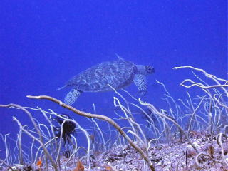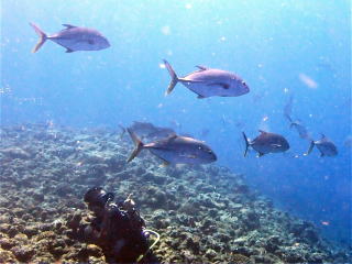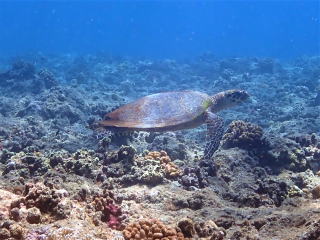 グルクンがたくさんいました。オニヒラアジ・スマガツオ・カスミアジ・アオウミガメ・タイマイ・アオリイカなど、たくさんの生き物が見られて楽しめました。11時20分前に船に戻りました。