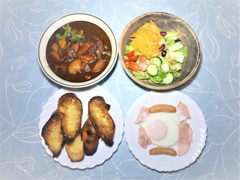 | 28日(日) 目玉焼き(卵・ハム・ベーコン・ウインナー)+野菜サラダ +カマンベールチーズ+トースト+オニオンスープ+牛乳♪ ![]() ベーコンとほうれん草のグラタンチーズ焼き +合鴨パストラミ+カマンベールチーズ♪ ![]() ビーフカツカレー(カレールー・惣菜三元豚のカツ・和牛もも肉 ・タマネギ・ニンジン・ジャガイモ・カレーパウダー・牛乳・バター) +豚汁(豚肉・タマネギ・ニンジン・ジャガイモ・ゴボウ) +具だくさんサラダ+炊きたてご飯+野沢菜漬け+カツオたくあん♪ ![]() |