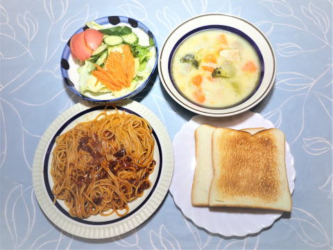 | 1日(月) 目玉焼き(卵・ハム・ ベーコン・ウインナー)+野菜サラダ +カマンベールチーズ+カボチャのポタージュ+トースト+牛乳♪ ![]() ソース焼うどん(玉うどん・ソース焼きそばのタレ・挽肉 ・笹かまぼこ・キャベツ・ピーマン・玉ねぎ・もやし)♪ ![]() チキンカレー(残り・ご飯・目玉焼き)+コーンスープ(残り) +具だくさんサラダ+ちょい辛胡瓜と茄子の漬物 +野沢菜漬けと梅ひじき♪ ![]() |