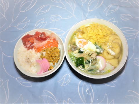 | 24日(水) 鍋焼きうどん(玉うどん・魚三角揚げ・チーズかまぼこ ・天かす・白菜・長ネギ・木綿豆腐・生卵・鯛と帆立のだし)♪ ![]() チキンカツとボロネーゼソース(鶏もも肉・ボロネーゼソース ・キャベツの千切り)+濃厚クリームシチュー(豚もも肉・ ジャガイモ・タマネギ・ニンジン・牛乳) +具だくさんサラダ+ご飯+カツオたくあん♪ ![]() ショートケーキ ♪ ![]() |