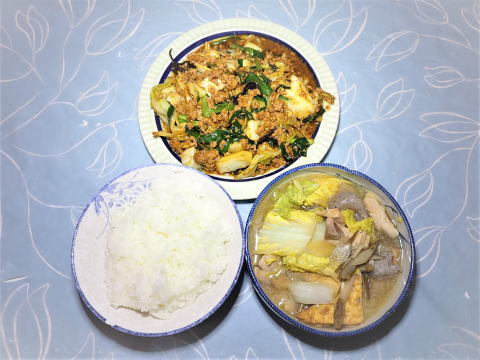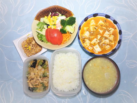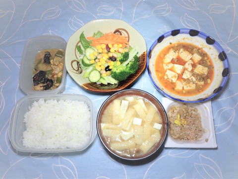 | 6日(火) スパゲッティーアサリコンソメ(レトルト)+野菜サラダ+トースト♪ ![]() 麻婆豆腐(麻+婆豆腐辛口の素・挽肉・木綿豆腐・豆板醤 ・花椒ラー油他)+野菜 の味噌汁(三角揚げ・キャベツ ・人参・ほうれん草・ぶなしめじ)+ご飯♪ ![]() |