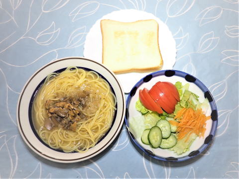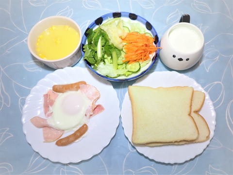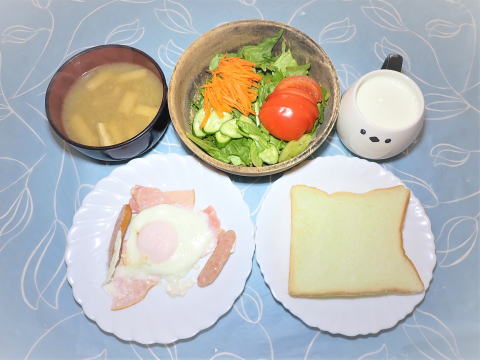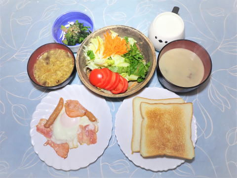 | 23日(金) 目玉焼き(卵・ハム・ベーコン・ウインナー)+野菜サラダ +椎茸と鶏肉の中華風スープ(残り)+シジミの味噌汁+トースト+牛乳♪ ![]() |