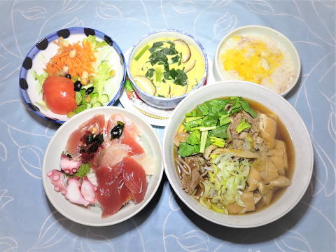 | 18日(日) 具だくさん味噌煮(残り)+椎茸と鶏肉の中華風スープ(残り) +野菜サラダ+納豆+ご飯+イワシの生姜煮+キュウリのぬか漬け +ピリ辛茄子とキュウリの漬物♪ ![]() 海鮮丼(マグロ・ハマチ・タコ・大和芋)+きつね蕎麦(山形谷地奴蕎麦 ・豚肉・油揚げ・椎茸・舞茸・ほうれん草・長ネギ出汁)+茶碗蒸し (卵・冷凍エビ,イカ,アサリ・椎茸・ほうれん草・出汁)+野菜サラダ +ご飯+キュウリのぬか漬け+イワシの生姜煮♪ ![]() |