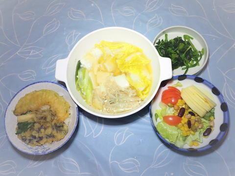 | 24日(土) 湯豆腐(絹豆腐・白菜・長ネギ・エノキ・ゴボウ・出汁)+天丼(茄子・ カボチャ・舞茸・大葉)+具だくさんサラダ+ほうれん草のおひたし♪ ![]() |