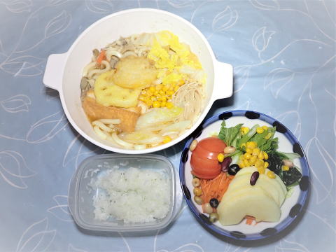 | 25日(日) 具だくさん鍋焼きうどん(玉うどん・絹厚揚げ・白菜・長ネギ ・レンコンとサツマイモの天ぷら・舞茸・エノキ・ゴボウ) +具だくさんサラダ+ご飯+キムチ+イワシの生姜煮♪ ![]() |