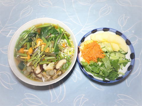 | 26日(月) 山菜そば(山形谷地 奴蕎麦・深山山渓 山菜ミックス・長ネギ ・ほうれん草・椎茸・ゴボウ・出汁)+野菜 サラダ♪ ![]() |