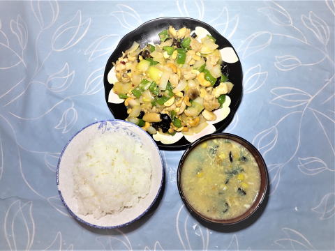 | 9日(金) レバーと野菜炒め定食♪ ![]() 鶏のカシューナッツ炒め(鶏もも肉・カシューナッツ・ピーマン ・タマネギ・ぶなしめじ)+コーンと帆立の中華スープ (スープの素・人参・エノキ・キクラゲ・卵)+炊きたてご飯 +ピリ辛茄子とキュウリの漬物♪ ![]() |