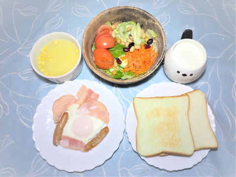 | 5日(木) 目玉焼き(卵・ハム・ベーコン・ウインナー)+野菜サラダ +粒入りコーンスープ(インスタント)+トースト+牛乳♪ ![]() 焼き豚チャーハン(冷凍チャーハン)+ゆず塩ラーメン(日清ラ王 ・白菜・玉ねぎ・ニラ・椎茸・白髪ネギ)+具だくさんサラダ +赤しば漬け・お茶漬けパリパリ♪ ![]() |