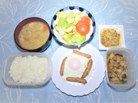 | 7日(土) 目玉焼き(卵・ウインナー)+ガリバタチキン(残り)+豚汁(残り) +野菜サラダ+ご飯+納豆+新漬けたくあん♪ ![]() |