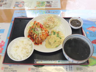 綾人くんは「海鮮丼\1500」と私は「本日の日替わり定食Aとイカスミ汁\1500」を食べた。 本日の日替わり定食A (白身魚フライのチリマヨ&ハニーマスタードソース・もずく酢・ご飯)+イカスミ汁 まあまあ美味しかった。イカスミ汁はイカスミの味まんまだった。大根は真っ黒で、イカの身も黒く染まっていた。割と美味しく食べられた。