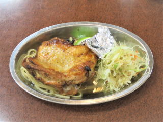 5時半頃からちゃんと寝た。6時半頃起きて、今日も「ポコポン」に行くことにした。6時55分頃出て7時5分頃着いた。地元のおじさん2人と、後から1人来た。若い青年が定食を食べていたが、メニューは何処に書いてあったのか分からなかった。 骨付きハーブ鶏焼+鶏のホルモン焼+天ぷら(エビ2本茄子・オクラ・カボチャ
