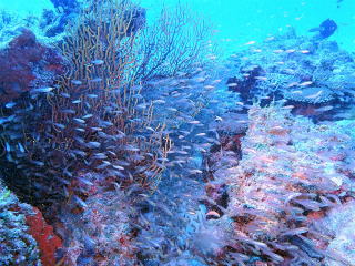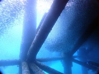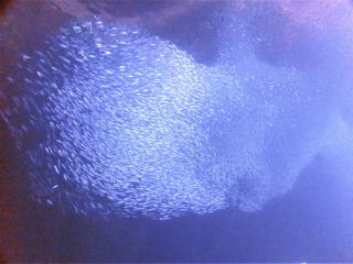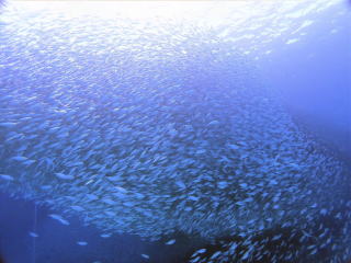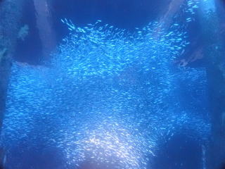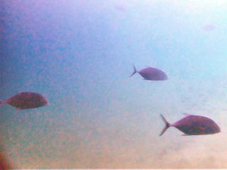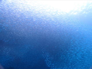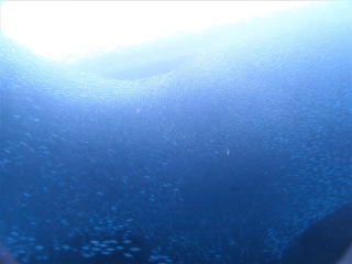 9時半頃ジャイアントでエントリーした。エントリーの時フィンがラダーに挟まって抜けなくて苦労した。ブリーフィングで、海面近くの透視度はかなり悪いようなので、エントリーしたら海面を移動して、船の後ろのロープにつかまって海底まで潜るように言われた。