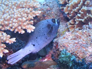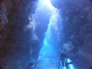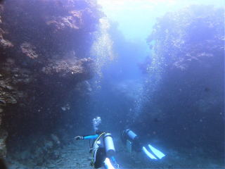 気分も良くなったので、だいぶ余裕が出ていた。おば様は浮き気味にならずに泳げていた。ただ 1本目からフィンキックの数が多いのが気になっていた。岩場のポイントなので、透視度は少しは良くなっていた。岩のエッジ伝いに泳いで、谷間や広場を泳いで、トンネルをくぐって外に出た。トンネルをくぐる時に、以前タンクがつっかえてしまった出口だと思い出した。谷間では岩穴にハタンポやコブシメやテングガワハギが普通に泳いでいた。ライトを照らして魚がいることを見せてあげた。無事にダイビングができて11時40分頃船に戻った。