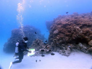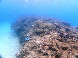 10時過ぎに船に戻ったが、船酔いをしている感じで、 結構気持ち悪かった。水を飲んだりして様子を見た。次のポイントの瀬底島に移動して少し休んだ。おば様から「どうしたら息が長く続きますか?」と聞かれたが、たぶん酸素の消費量だと思った。考えたが「こつはないです」と答えた。「ただ楽しく潜ることです」と話した。細かなことを言うよりも良いと思った。