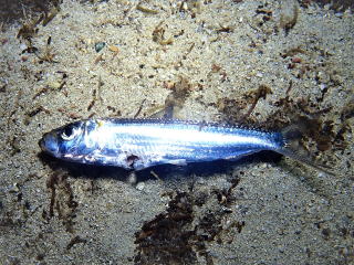 透視度は今日1番で良かった。砂地に大きな根が一個あった。他に根のような物はなく、砂地でいろいろ探しながら桟橋の方に泳いでいった。桟橋と言っても船が出入りするわけではなく、何かの運搬船?がいつも停泊していた。桟橋の近くに来ると、たぶんガジュン?の群れが広がっていた。なかなかの数でちょっと驚いた。あまり近づけなかったので、銀色の魚の色とちょっと濁った海水とで、姿が少しぼやけていたのが残念だった。橋脚の下にグルクマの群れがいた。あんなに近くで、グルクマが口を開けている姿を見たのは初めてだった。たくさん写真を撮った。初めて桟橋の下に入った。中は薄暗かったが、本当に無数のミジュンが塊の群れを作っていて、光を当てると「パッ」と散らばって、また塊になるのが面白かった。数は数万匹はいると思った。見ていて飽きなかった。ミジュンが一匹息絶え絶えで海底に横になっていたので、写真を撮って全体の姿を確認した。後で調べたら…ミジュン:ニシン目、ママカリ、シンコ…の事だった。以前バラス南で見たミジュンは、もっと小さかった気がした。アッという間の45分だった。