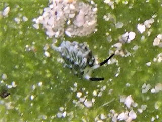 葉っぱのような海藻に、小さなウミウシがいると言われて写真を撮ったが、姿を勘違いしていた。後で写真を見て初めて分かった。ミナミウミノシタやモンハナシャコもいた。桟橋の下には、相変わらずミジュンとガジュンの群れがすごかった。それらの小魚を狙ってカスミアジ?の群れが周りを泳いでいた。ミナミハコフグが可愛かった。ずっと写真を撮っていた。ミノカサゴやツバメガイもいた。
