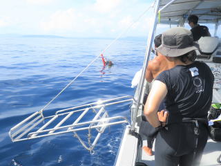 「3・2・1ゴー」で他の人が バックロールで海に入ったが、私は何が起こっているのか分からないまま船の縁に座っていった。ちょっと爆笑物だった。「大丈夫ですよ」と言われて、状況を把握して無事エントリー