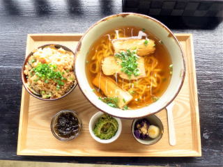 中は良い雰囲気で、券売機は最新の機械だった。 三枚肉そばと ジューシーセット そばつゆは出汁がしっかり効いていて、なかなか美味しかった。ジューシーも出汁で美味しく焚かれていた。小鉢も3個付いていた。外のベランダで食べた。