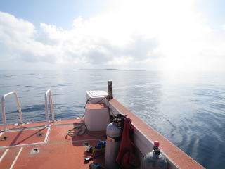 港に行って船に乗り込んで、器材の準備をして出港の手伝いをした。8時40分 頃出航した。昨日より少し海面がざわついていたが、良い天気で気持ちよかった。今日はおば様と2人なので、1本目はどこに行くのかなぁ〜と思っていたら、トカキン曽根だった。