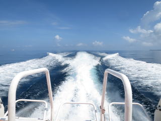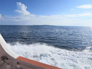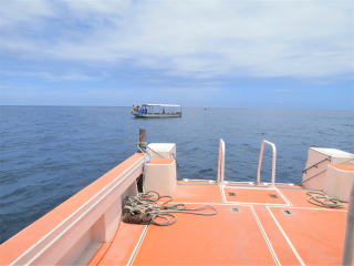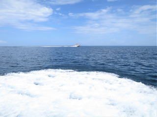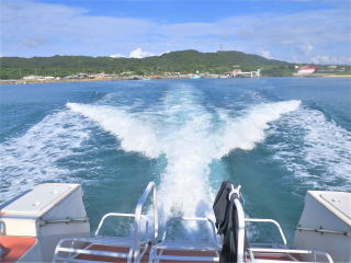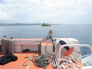 2時30分発の安栄の船に間に合いそうなので、テキパキ帰る支度をした。潜行ロープを上げてラダーを上げた。ウエットスーツ・BC・小物類にシャワーの水をかけて、少しでも塩水を洗い流した。後ろのラダーにかけて干しておいた。1時半前に干し終わって港に向けて出港した。トイレで着替えてブイを下ろして、船の先でロープを取った。