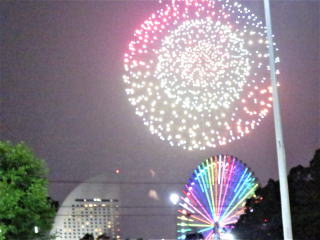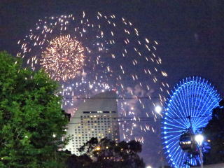 お土産や小物類の整理をして、7時前に一段落ついて着替えた。今日は花火大会なので、遠くからでも少し観て写真を 撮りたいと思って7時20分頃家を出て37分頃桜木町の駅に着いた。7時半頃から花火は上がっていた。駅前で写真を撮って7時50分頃鳥良に着いた。