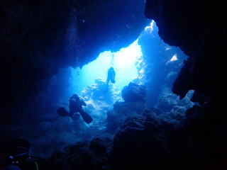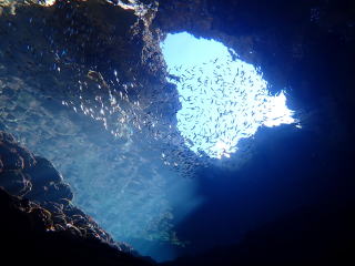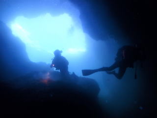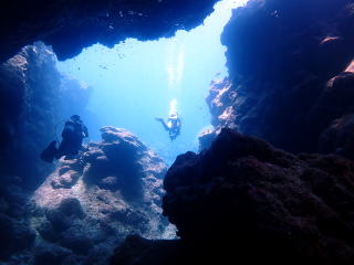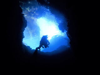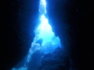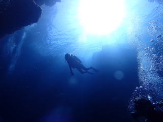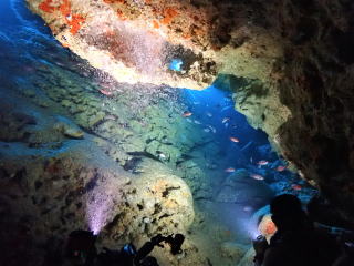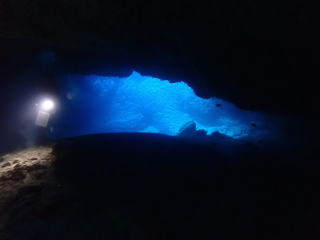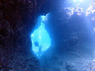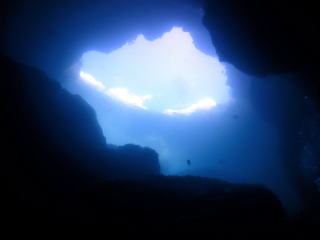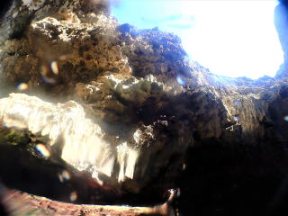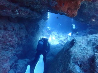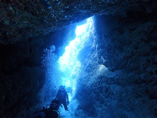 今回潜りたかったポイントの1つでした。光の加減と大きな洞窟の様子は、なかなか迫力があって好きなポイントです。池に浮上しました。池の底には「藻」がたくさん付いていました。川本さんが「藻から泡が出ていますが、光合成をして吐き出した酸素ですかね?」と言っていました。良く見たら確かに泡を出していて、光合成をして作った酸素だろうと思いました。ミニ通り池とは透明度が全然違いますが、普通に「池」って感じでした。魔王の部屋もいいですが、「マリンレイク」の方が迫力があって好きでした。