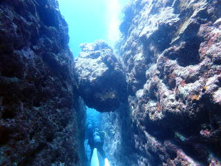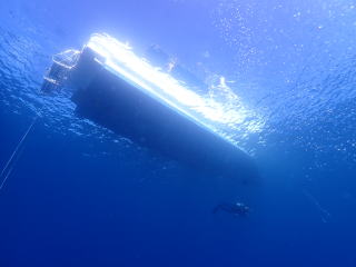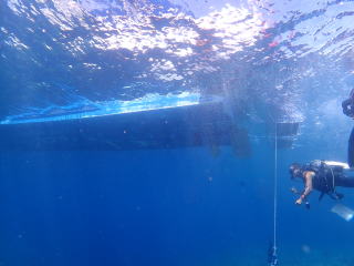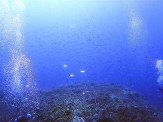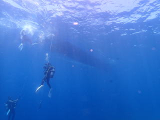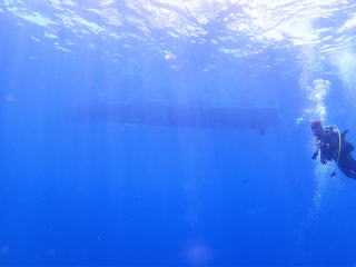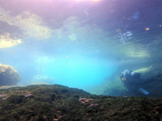 9時頃1本目のポイントの「ミニ 通り池」に着いて、9時15分頃エントリーしました。今回は船の後ろでたくさんの人が準備していたので、前からバックロールでエントリーしました。綾人くんのところで慣れていて良かったと思いました。